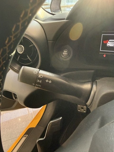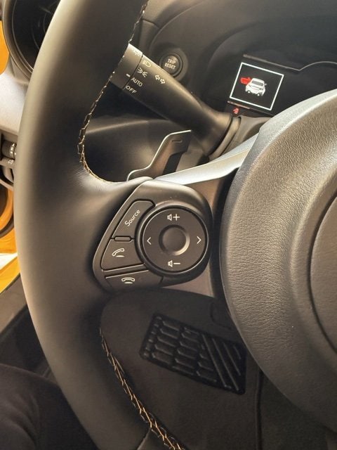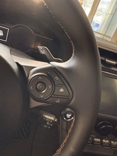 - GR leather-trimmed manual tilt/telescopic 3-spoke sport steering wheel with yellow contrast stitching, audio, Multi-Information Display (MID), Adaptive Cruise Control button, and paddle shifters
