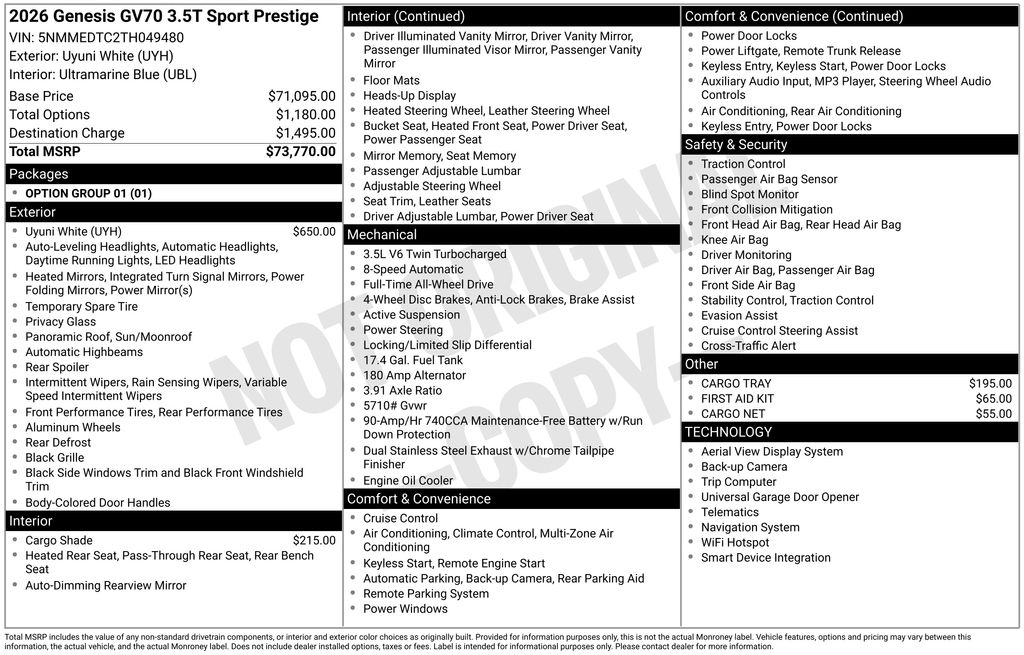 The Certified 2026 Genesis GV70 3.5T Sport Prestige is a high-performance luxury SUV that delivers exhilarating power, athletic handling, and sophisticated stylenow backed by the confidence of Genesis Certified Pre-Owned coverage. Driven by a robust 3.5-liter twin-turbo V6 engine, this GV70 produces thrilling acceleration and dynamic response, making every drivefrom spirited back-road outings to daily commutesexciting and effortless.