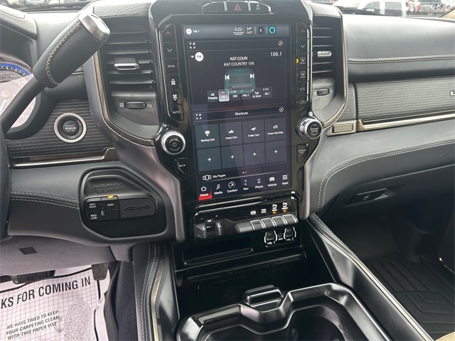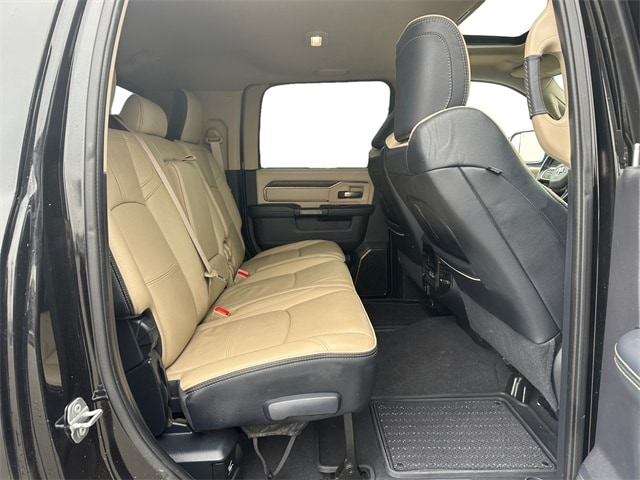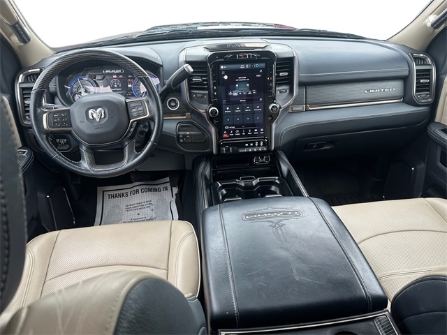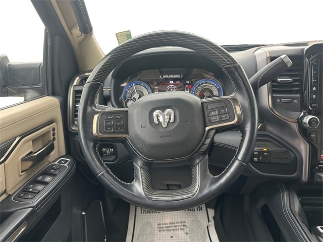 Odometer is 7107 miles below market average! NON SMOKER, REAR CAMERA, MOONROOF/SUNROOF, APPLE CARPLAY/ANDROID AUTO, BLUETOOTH, 10 Speakers, 12" Touchscreen Display, 220 Amp Alternator, 3.73 Axle Ratio, 4-Wheel Disc Brakes, 4G LTE Wi-Fi Hot Spot, ABS brakes, Active Noise Control System, Adjustable pedals, Air Conditioning, Alloy wheels, AM/FM radio: SiriusXM with 360L, Apple CarPlay, Apple CarPlay/Android Auto, Audio memory, Auto High-beam Headlights, Auto-dimming Rear-View mirror, Automatic temperature control, Bodyside moldings, Brake assist, Bumpers: chrome, Center Hub, Clearance Lamps, Compass, Connected Travel & Traffic Services, Connectivity - US/Canada, CTR Stop Lamp w/Cargo View Camera, Delay-off headlights, Disassociated Touchscreen Display, Driver door bin, Driver vanity mirror, Dual front impact airbags, Dual front side impact airbags, Electronic Stability Control, Electronically Controlled Throttle, Engine Block Heater, Front anti-roll bar, Front Bucket Seats, Front Center Armrest w/Storage, Front dual zone A/C, Front fog lights, Front License Plate Bracket, Front reading lights, Fully automatic headlights, Garage door transmitter, Genuine wood console insert, Genuine wood dashboard insert, Genuine wood door panel insert, Global Telematics Box Module (TBM), Google Android Auto, GPS Antenna Input, GPS Navigation, HD Radio, Heated door mirrors, Heated front seats, Heated rear seats, Heated steering wheel, Illuminated entry, Integrated Voice Command w/Bluetooth, Leather steering wheel, Limited Leather Bucket Seats, Low tire pressure warning, Manufacturer's Statement of Origin, Memory seat, Navigation System, Occupant sensing airbag, Off-Road Information Pages, Outside temperature display, Overhead airbag, Overhead console, Panic alarm, ParkView Rear Back-Up Camera, Passenger door bin, Passenger vanity mirror, Pedal memory, Pickup Box, Power door mirrors, Power driver seat, Power passenger seat, Power steering, Power Sunroof, Power windows, Protection Group, Quick Order Package 2HM Limited, Radio data system, Radio: Uconnect 5 Nav w/12.0" Display, Rain sensing wipers, RamBox Delete, Rear reading lights, Rear seat center armrest, Rear step bumper, Rear window defroster, Remote keyless entry, Security system, Selectable Tire Fill Alert, SiriusXM w/360L, Speed control, Split folding rear seat, Steering wheel mounted audio controls, Surround View Camera System, Tachometer, Tilt steering wheel, Tip Start, Towing Technology Group, Traction control, Trailer Reverse Guidance, Trip computer, Turn signal indicator mirrors, Variably intermittent wipers, Vendor Painted Cargo Box, Vendor Painted Cargo Box Tracking, Ventilated front seats, Voltmeter, Wheels: 20" x 8.0" Satin Carbon w/Chrome Insert. Diamond Black Crystal Pearlcoat Cummins 6.7L I6 Turbodiesel 6-Speed Automatic 4WD